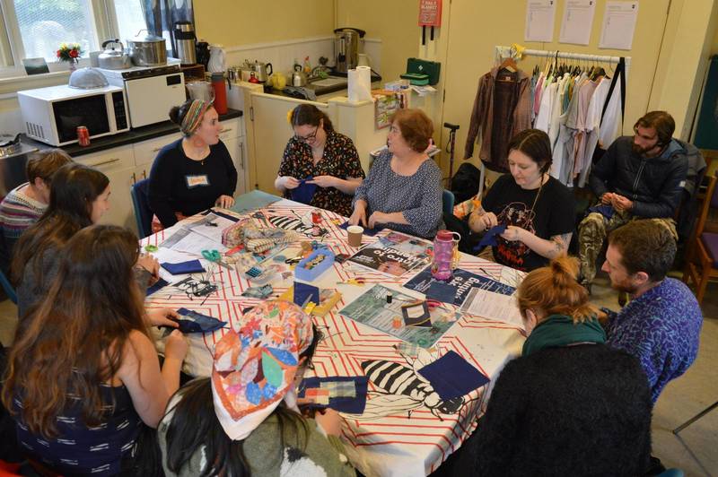 Under the guidance of Lea and Abi, kids and adults alike printed thier own custom VegFest merch. Leaves and sunlight and drops of rain entwined to make beautiful images with cyanotype printing faciliated by Yarrow. Well-loved clothes were given a new lease of life with visible mending techniques taught by Lauren Smith. The bustling atomsphere was punctuated by laughter and shared stories as multigenerational groups enjoyed sharing techniques and skills from t-shirt printing to colouring in, and young minds were encouraged to explore the wonder and chaos of the natural world in their aristic work.